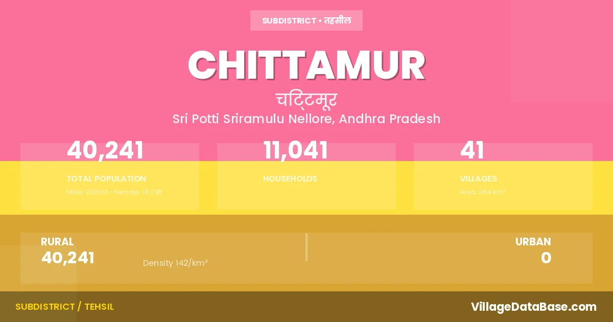 According to the 2011 census The total area of Chittamur Mandal is 284 km², with a population of 40241 people. The population density is 142 inhabitants per square kilometre, and there are approximately 11041 houses in the sub district.