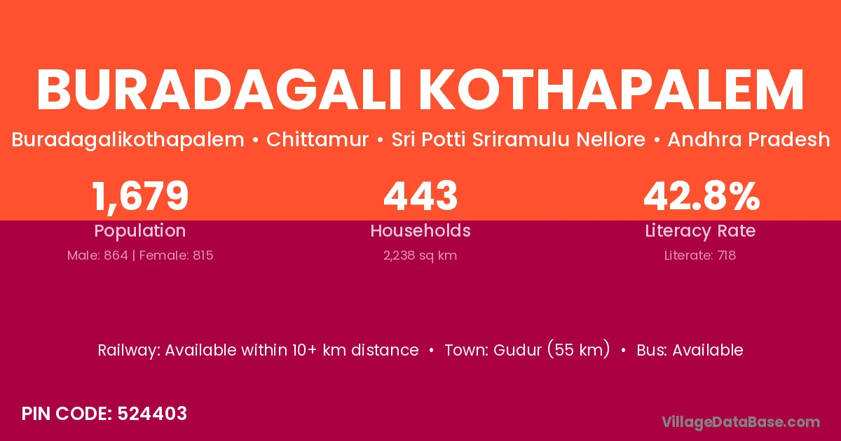 Gudur (55 km) is the nearest town to Buradagali Kothapalem village for major economic activities and is located approximately 55 km away.