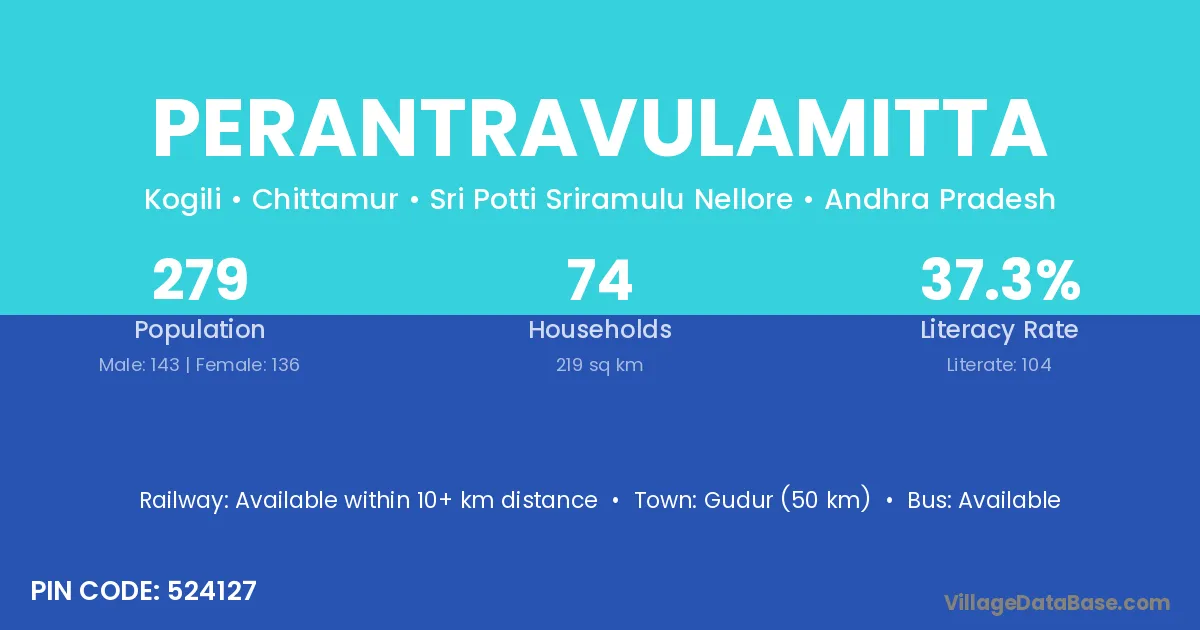 Gudur (50 km) is the nearest town to Perantravulamitta village for major economic activities and is located approximately 50 km away.