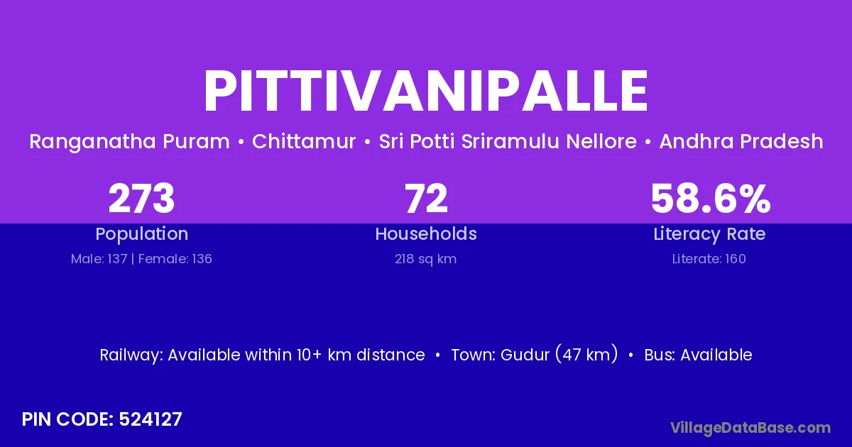 Gudur (47 km) is the nearest town to Pittivanipalle village for major economic activities and is located approximately 47 km away.
