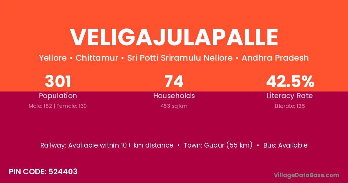 Veligajulapalle village has a total population of 301 people, of which 162 are males and 139 are females.