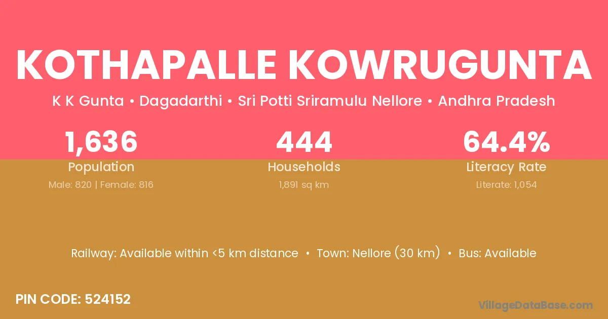 Nellore (30 km) is the nearest town to Kothapalle Kowrugunta village for major economic activities and is located approximately 30 km away.