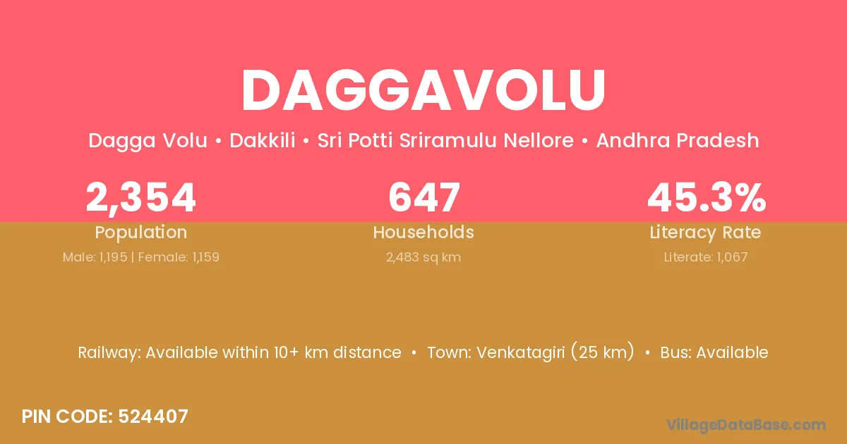 Venkatagiri (25 km) is the nearest town to Daggavolu village for major economic activities and is located approximately 25 km away.