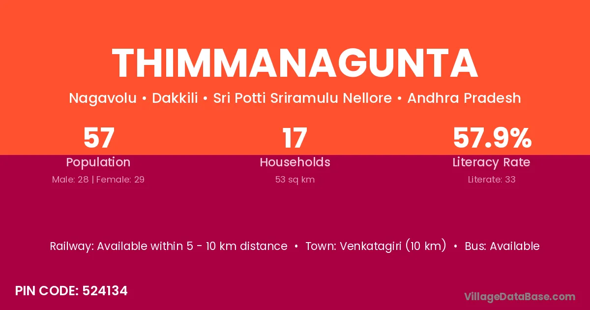 Venkatagiri (10 km) is the nearest town to Thimmanagunta village for major economic activities and is located approximately 10 km away.