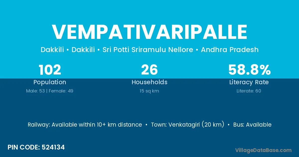 Venkatagiri (20 km) is the nearest town to Vempativaripalle village for major economic activities and is located approximately 20 km away.