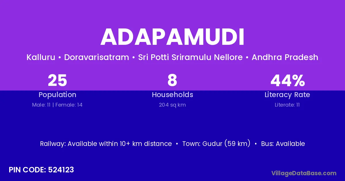Adapamudi village has a total population of 25 people, of which 11 are males and 14 are females.