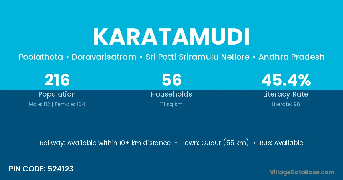 Karatamudi village has a total population of 216 people, of which 112 are males and 104 are females.