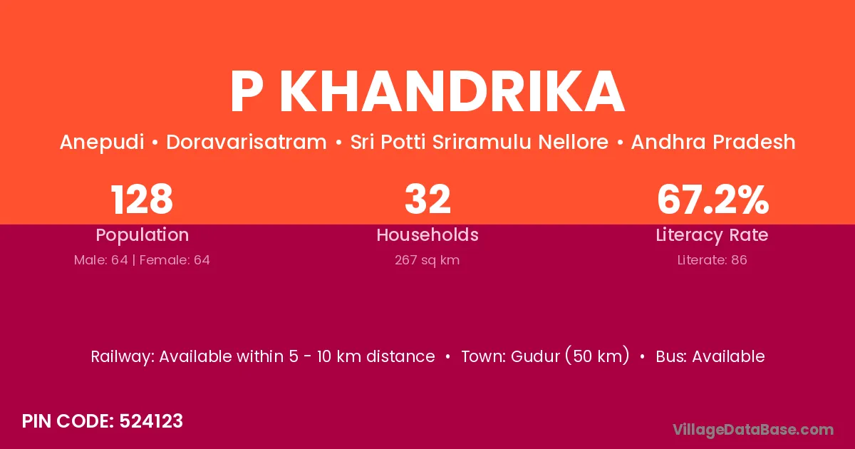 Gudur (50 km) is the nearest town to P Khandrika village for major economic activities and is located approximately 50 km away.