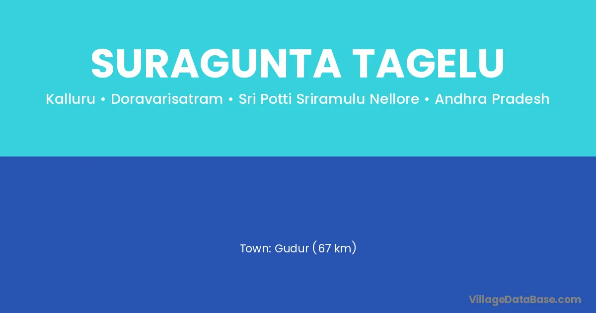 Gudur (67 km) is the nearest town to Suragunta Tagelu village for major economic activities and is located approximately 67 km away.