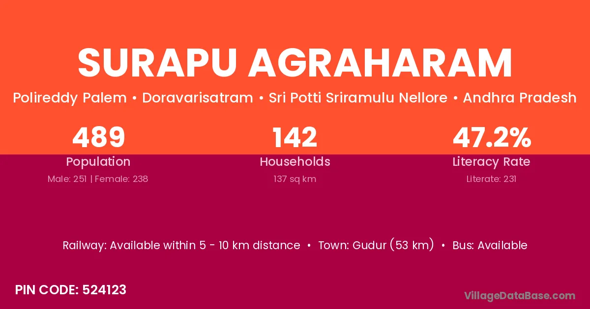 Surapu Agraharam village has a total population of 489 people, of which 251 are males and 238 are females.