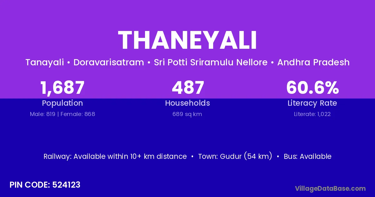 Gudur (54 km) is the nearest town to Thaneyali village for major economic activities and is located approximately 54 km away.