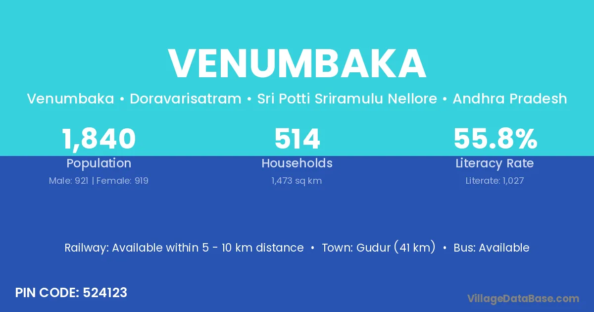 Gudur (41 km) is the nearest town to Venumbaka village for major economic activities and is located approximately 41 km away.