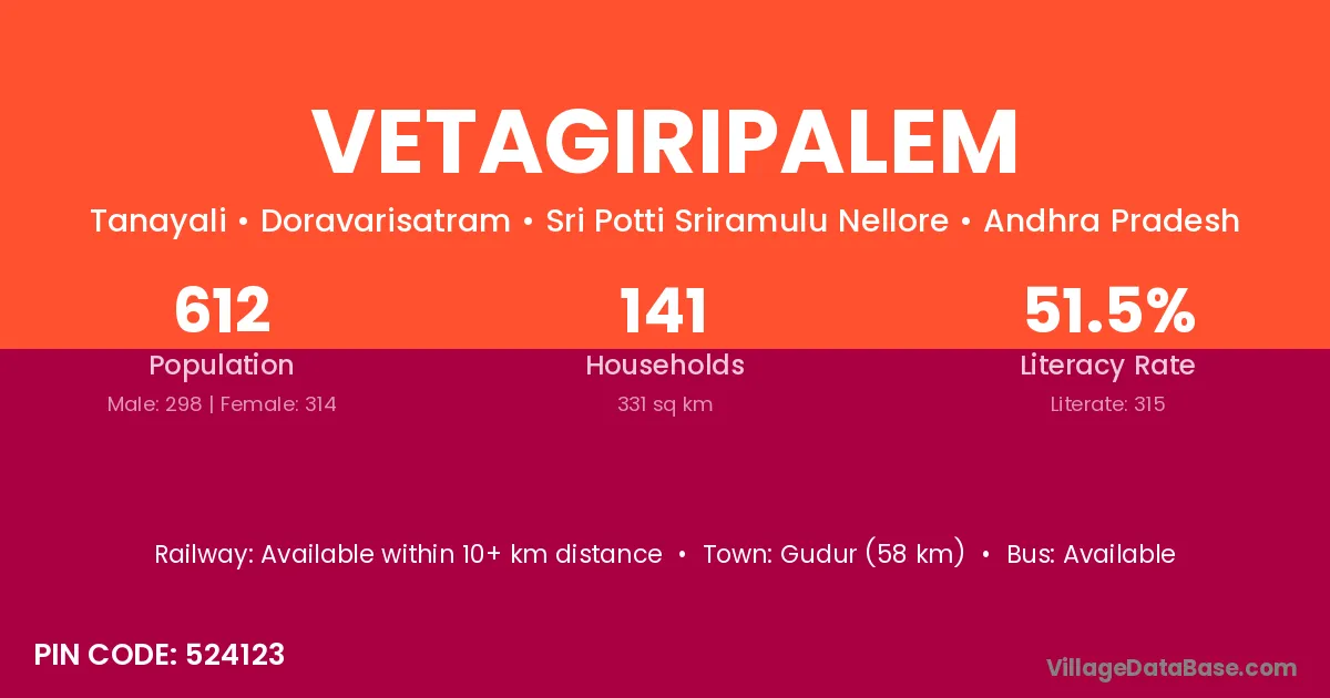 Vetagiripalem village has a total population of 612 people, of which 298 are males and 314 are females.