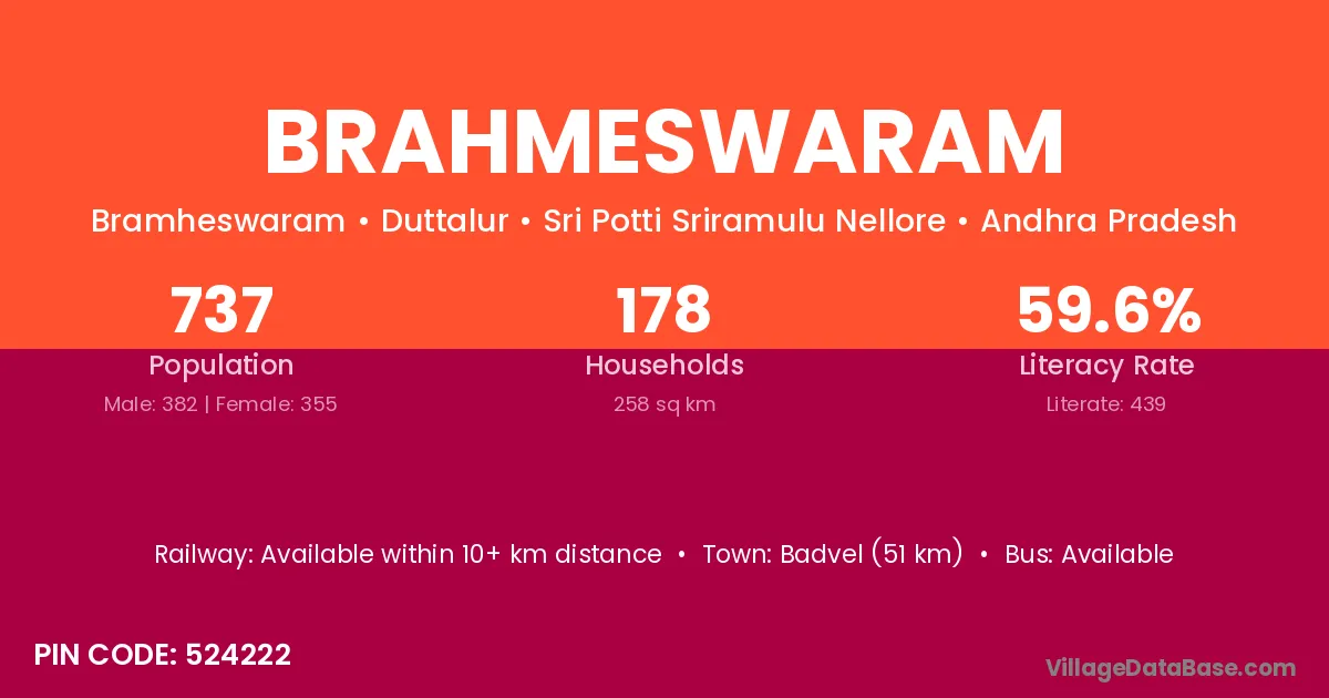 Brahmeswaram village has a total population of 737 people, of which 382 are males and 355 are females.