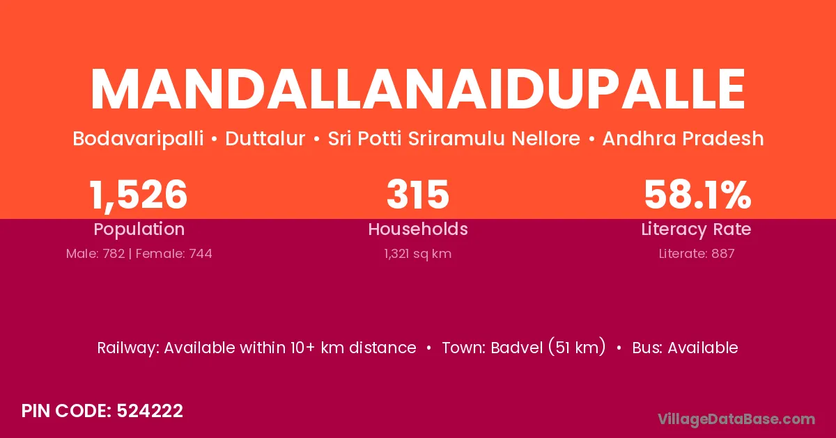 According to Census 2011 information, the village code of Mandallanaidupalle village is 524222.