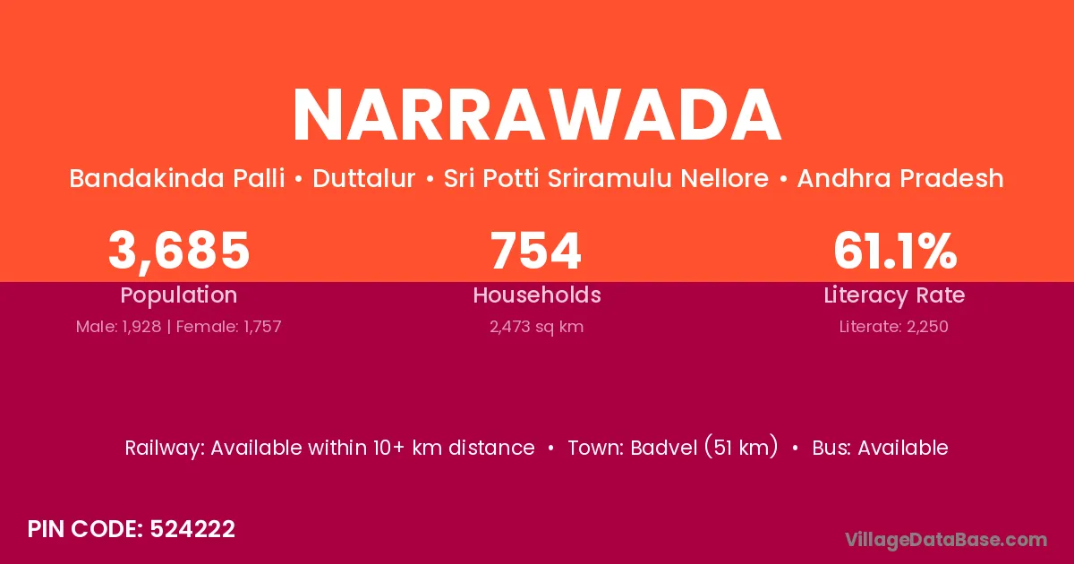 Badvel (51 km) is the nearest town to Narrawada village for major economic activities and is located approximately 51 km away.