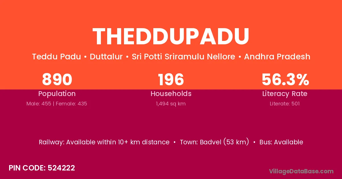 Theddupadu village has a total population of 890 people, of which 455 are males and 435 are females.