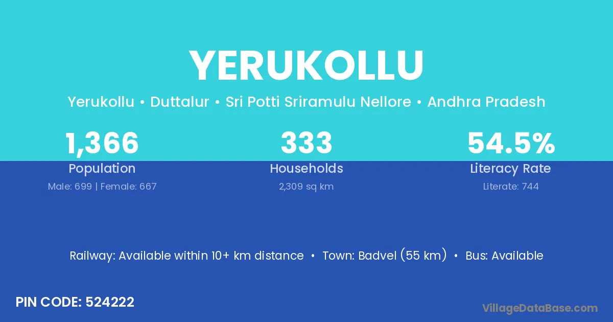 Badvel (55 km) is the nearest town to Yerukollu village for major economic activities and is located approximately 55 km away.