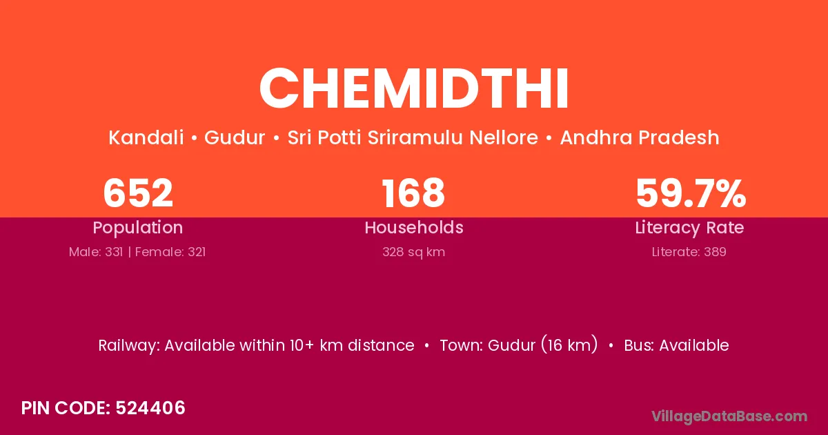 Gudur (16 km) is the nearest town to Chemidthi village for major economic activities and is located approximately 16 km away.