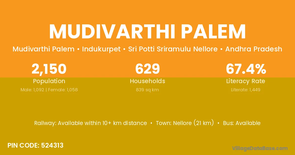 Nellore (21 km) is the nearest town to Mudivarthi Palem village for major economic activities and is located approximately 21 km away.