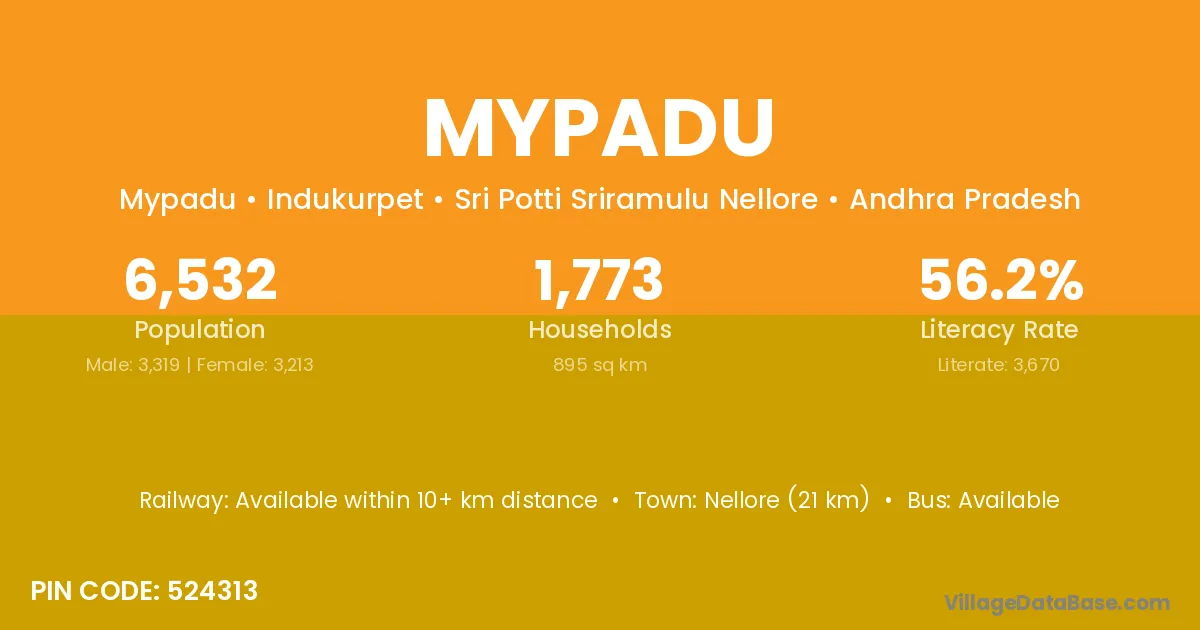 Nellore (21 km) is the nearest town to Mypadu village for major economic activities and is located approximately 21 km away.