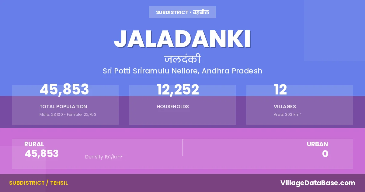 According to the 2011 census The total area of Jaladanki Mandal is 303 km², with a population of 45853 people. The population density is 151 inhabitants per square kilometre, and there are approximately 12252 houses in the sub district.