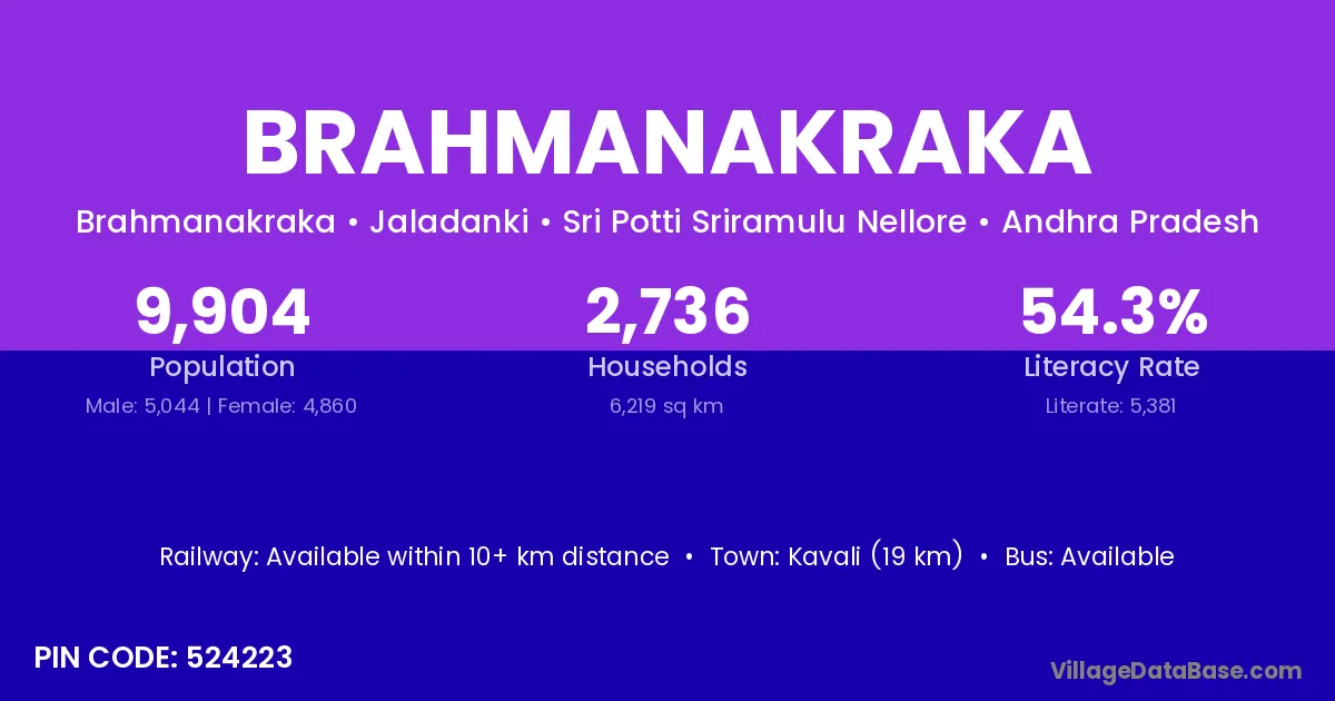 Kavali (19 km) is the nearest town to Brahmanakraka village for major economic activities and is located approximately 19 km away.