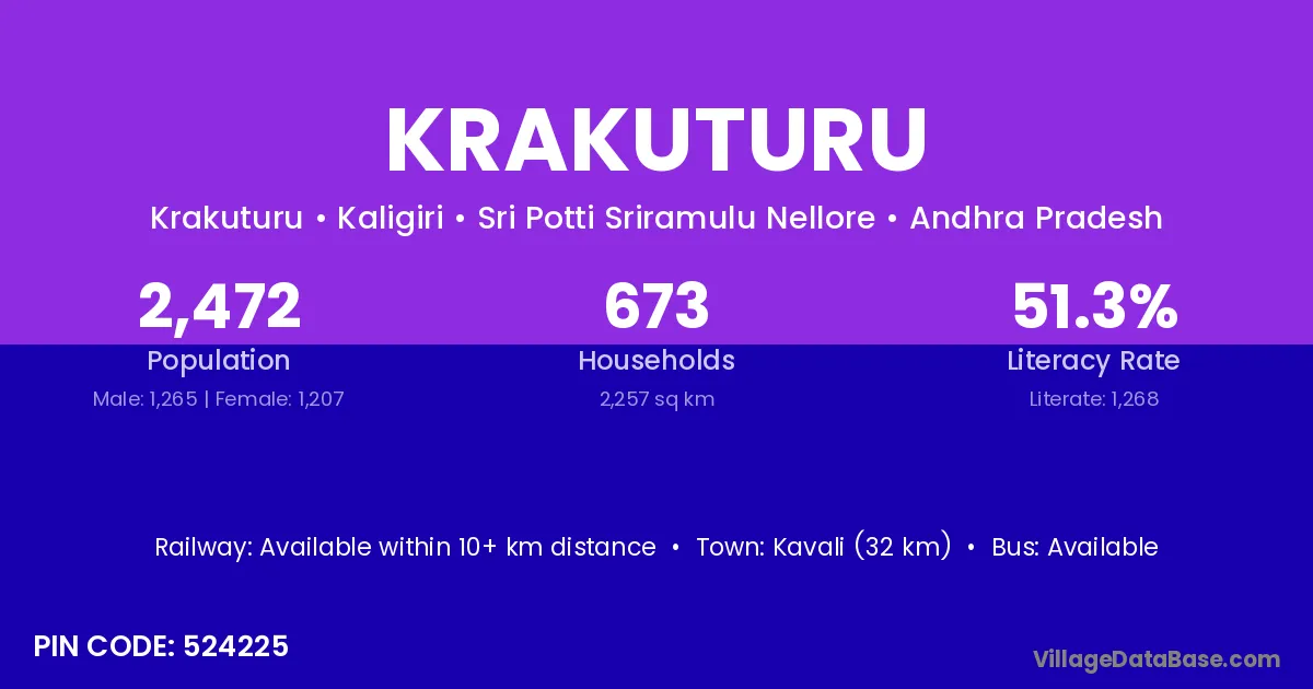 Kavali (32 km) is the nearest town to Krakuturu village for major economic activities and is located approximately 32 km away.