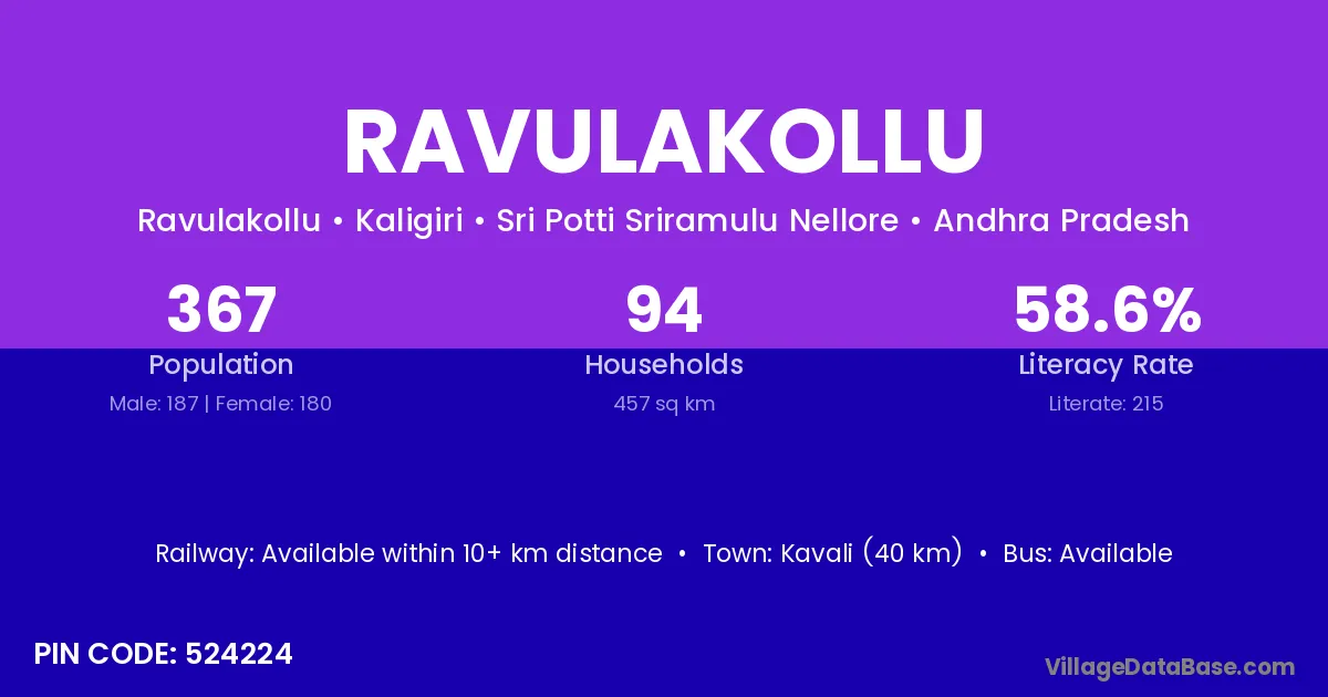 Kavali (40 km) is the nearest town to Ravulakollu village for major economic activities and is located approximately 40 km away.