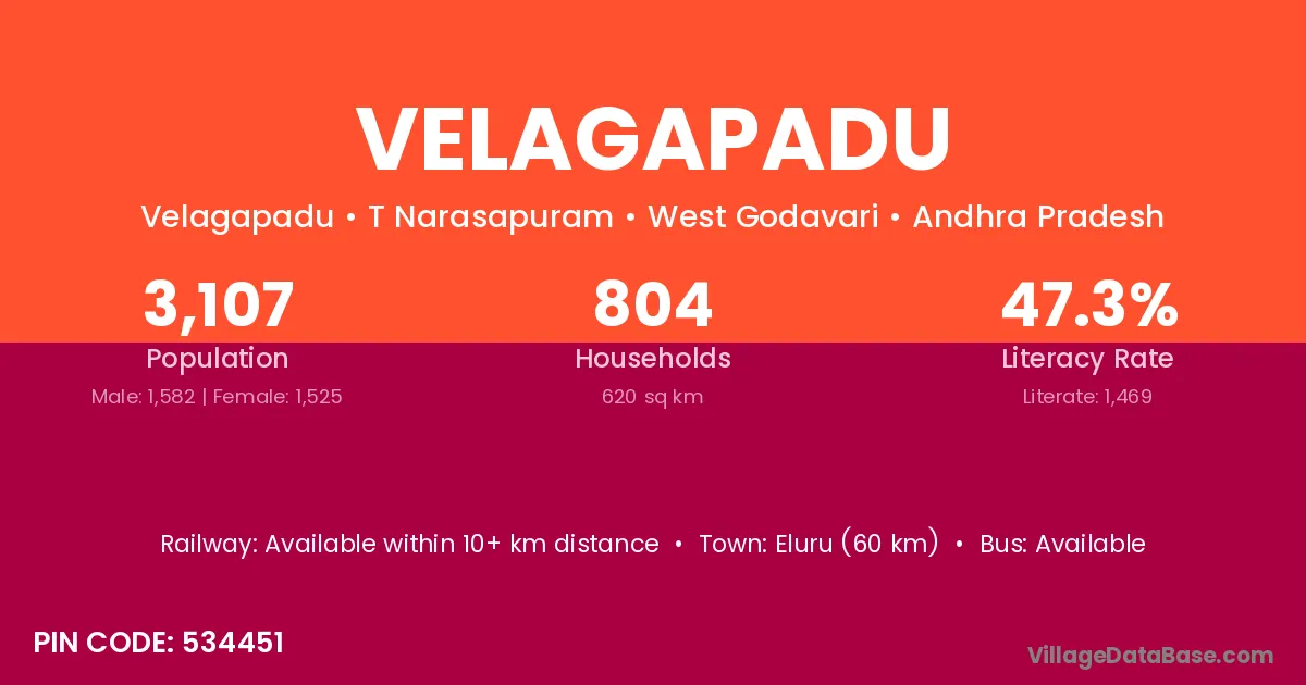 The literacy rate of Velagapadu village is 61.04%. Male literacy stands at 71.19% and female literacy at 50.56%.