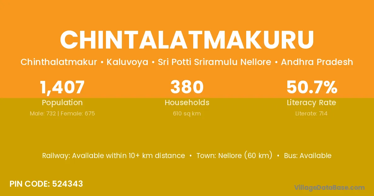 Nellore (60 km) is the nearest town to Chintalatmakuru village for major economic activities and is located approximately 60 km away.