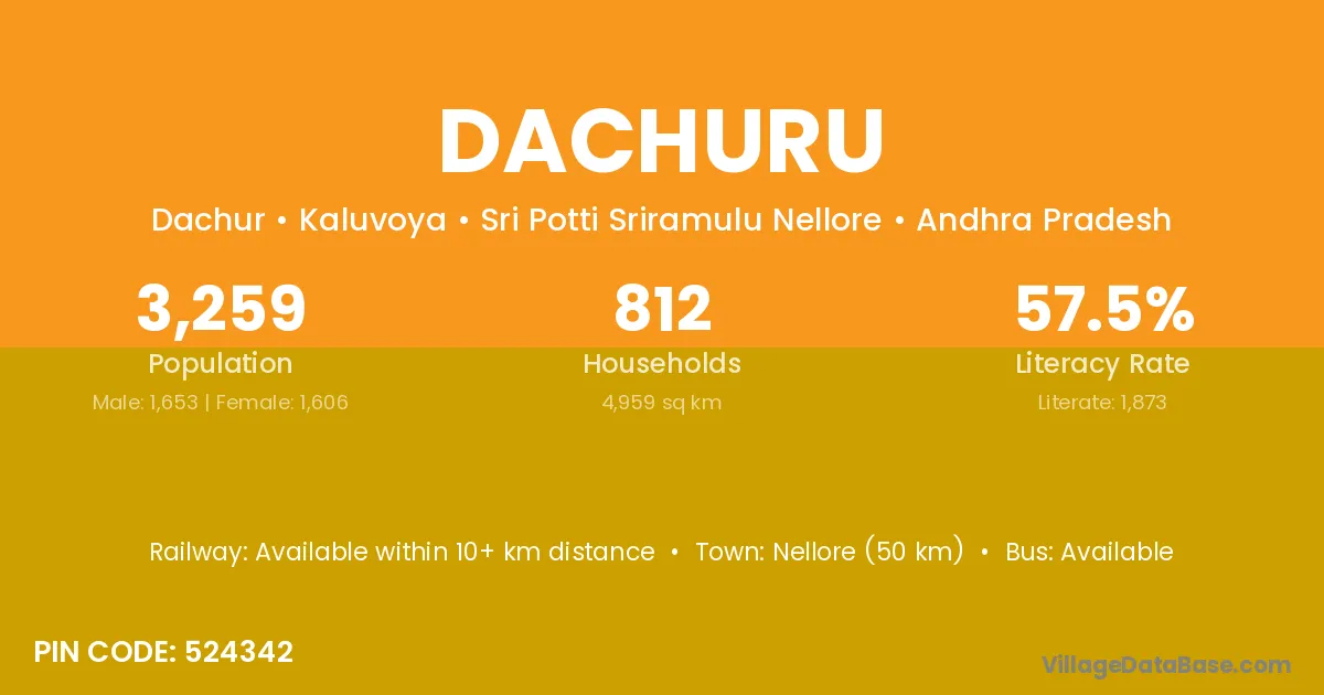 Nellore (50 km) is the nearest town to Dachuru village for major economic activities and is located approximately 50 km away.