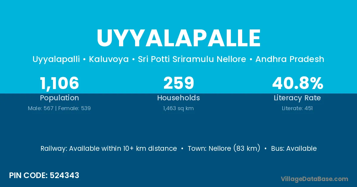Nellore (83 km) is the nearest town to Uyyalapalle village for major economic activities and is located approximately 83 km away.