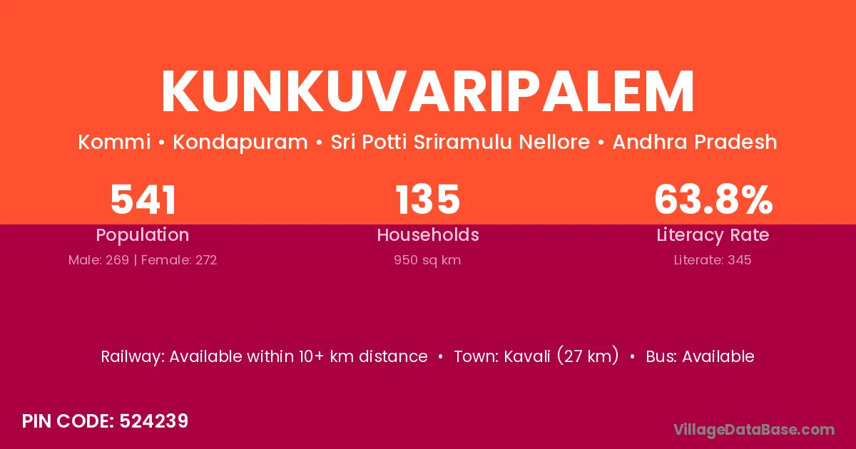 Kavali (27 km) is the nearest town to Kunkuvaripalem village for major economic activities and is located approximately 27 km away.