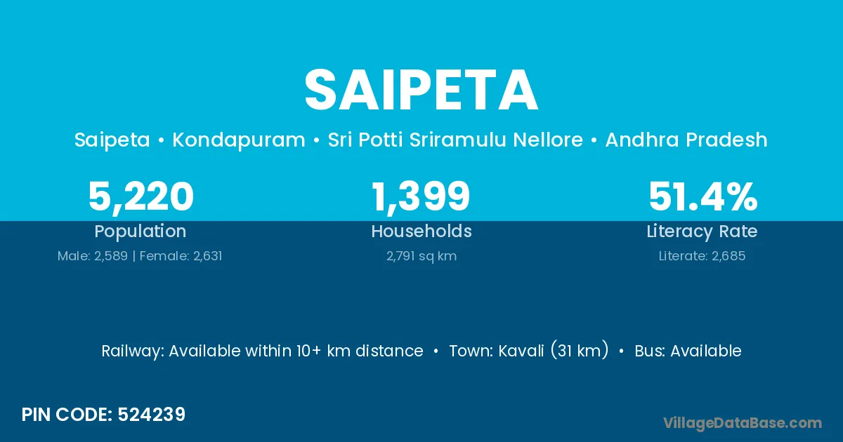 Kavali (31 km) is the nearest town to Saipeta village for major economic activities and is located approximately 31 km away.