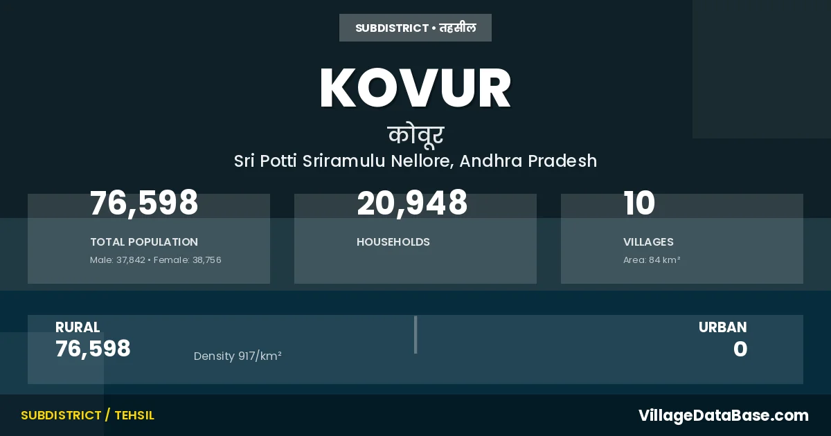 According to the 2011 census The total area of Kovur Mandal is 84 km², with a population of 76598 people. The population density is 917 inhabitants per square kilometre, and there are approximately 20948 houses in the sub district.