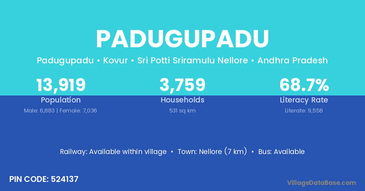 Nellore (7 km) is the nearest town to Padugupadu village for major economic activities and is located approximately 7 km away.