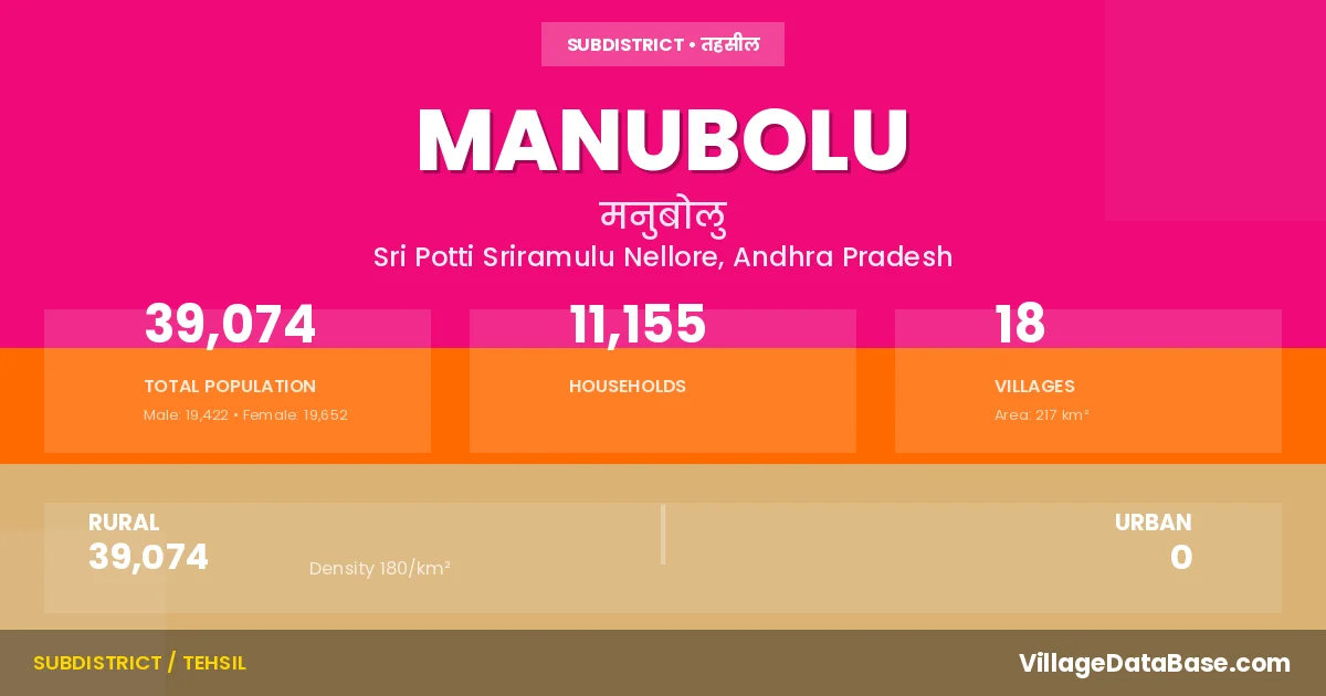 According to the 2011 census The total area of Manubolu Mandal is 217 km², with a population of 39074 people. The population density is 180 inhabitants per square kilometre, and there are approximately 11155 houses in the sub district.