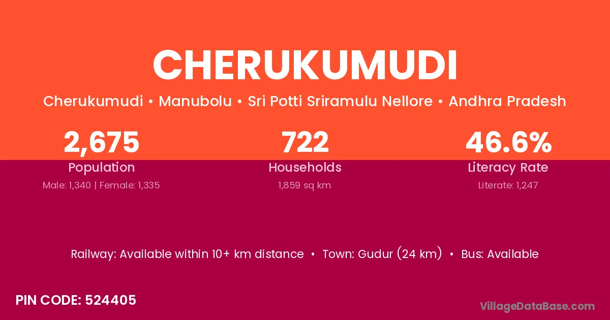 Gudur (24 km) is the nearest town to Cherukumudi village for major economic activities and is located approximately 24 km away.