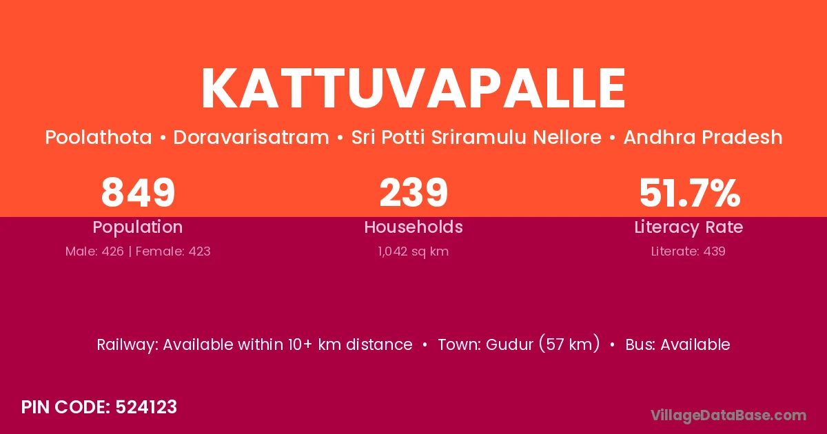 Gudur (14 km) is the nearest town to Kattuvapalle village for major economic activities and is located approximately 14 km away.