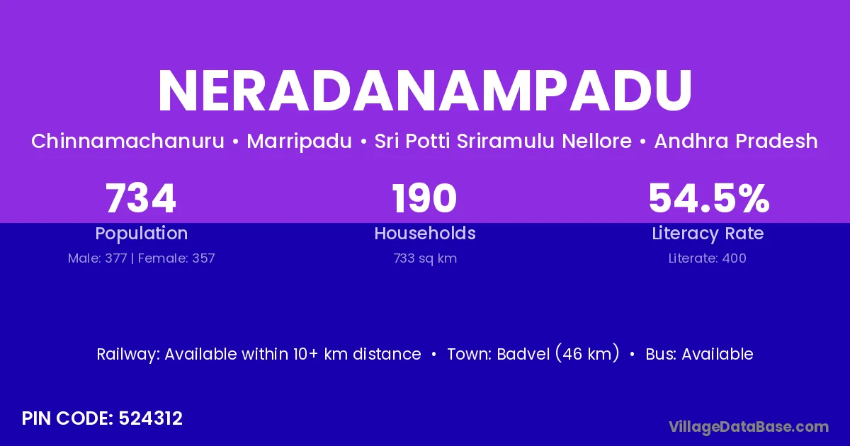 Badvel (46 km) is the nearest town to Neradanampadu village for major economic activities and is located approximately 46 km away.