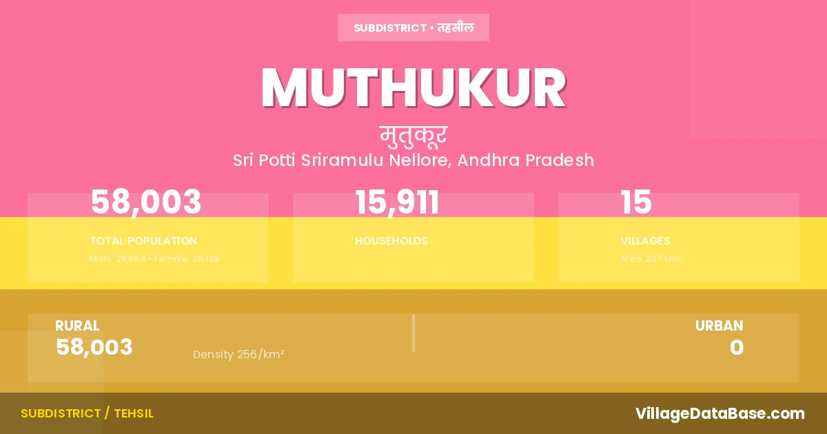 According to the 2011 census The total area of Muthukur Mandal is 227 km², with a population of 58003 people. The population density is 256 inhabitants per square kilometre, and there are approximately 15911 houses in the sub district.