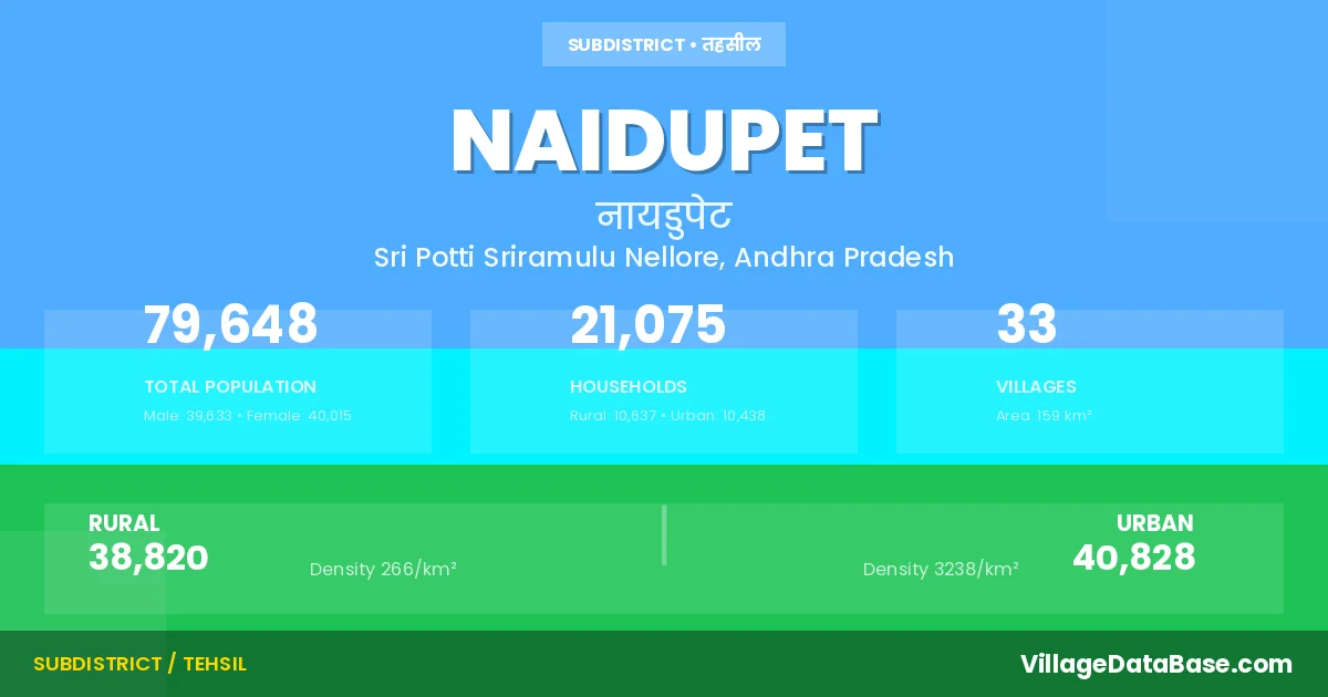 According to the 2011 census The total area of Naidupet Mandal is 159 km², with a population of 79648 people. The population density is 502 inhabitants per square kilometre, and there are approximately 21075 houses in the sub district.