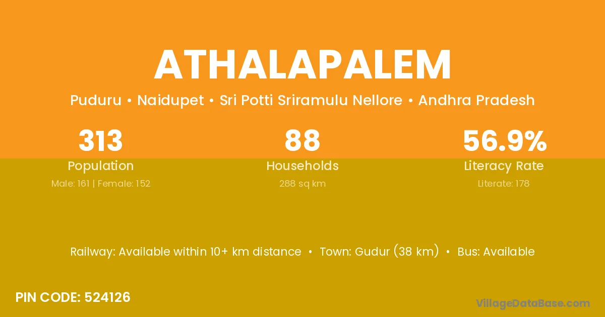 Gudur (38 km) is the nearest town to Athalapalem village for major economic activities and is located approximately 38 km away.