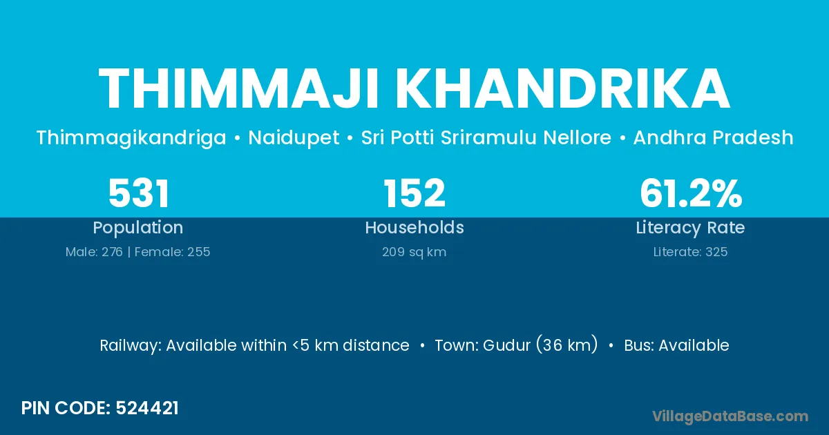 Gudur (36 km) is the nearest town to Thimmaji Khandrika village for major economic activities and is located approximately 36 km away.
