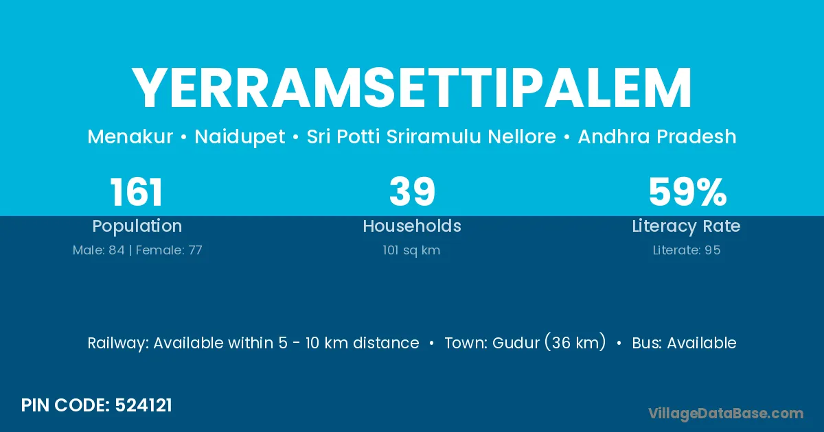 Gudur (36 km) is the nearest town to Yerramsettipalem village for major economic activities and is located approximately 36 km away.