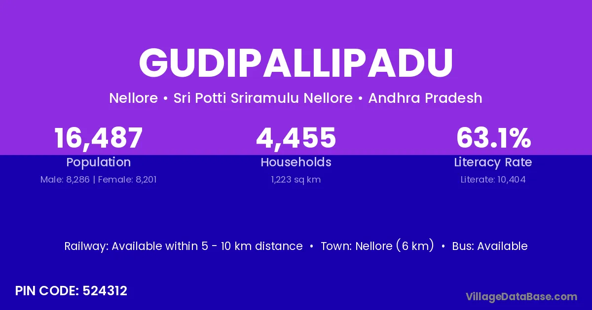 Nellore (6 km) is the nearest town to Gudipallipadu village for major economic activities and is located approximately 6 km away.