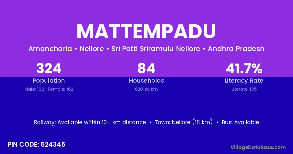 Nellore (18 km) is the nearest town to Mattempadu village for major economic activities and is located approximately 18 km away.