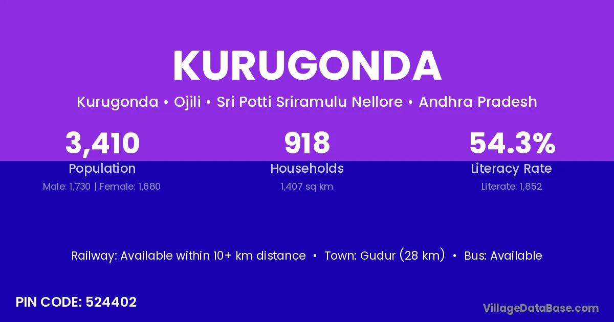 Gudur (28 km) is the nearest town to Kurugonda village for major economic activities and is located approximately 28 km away.