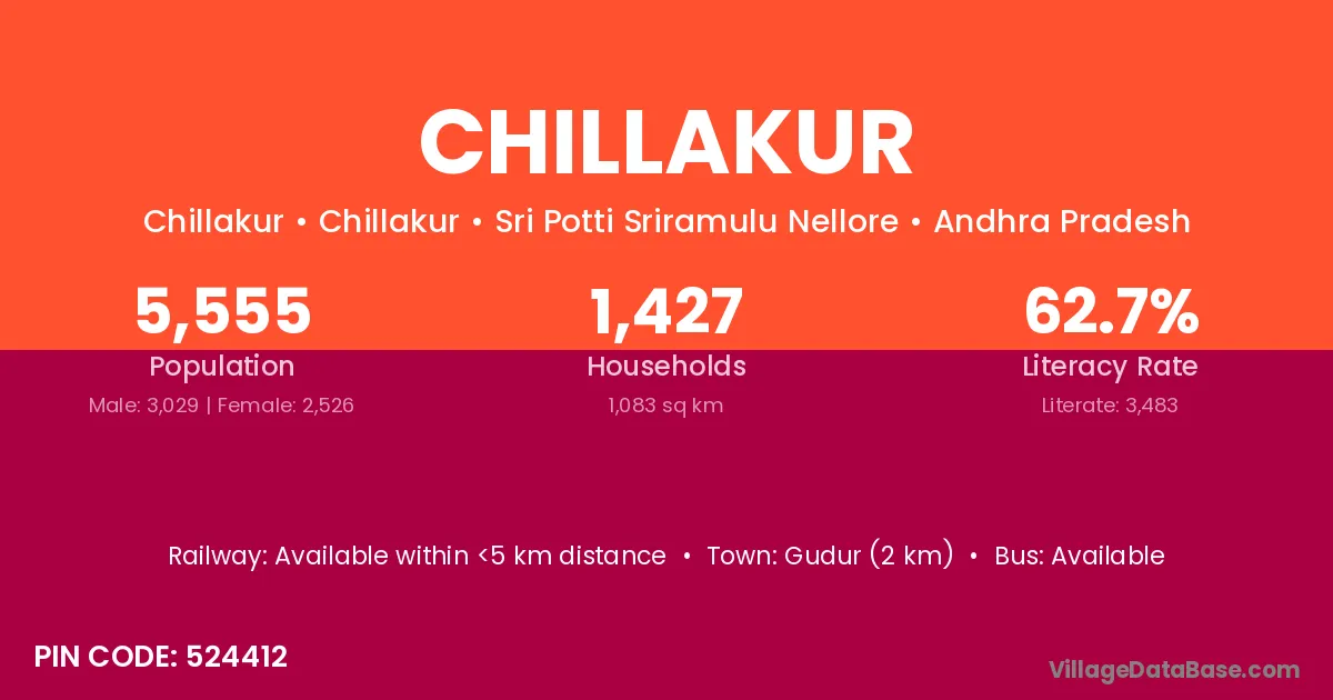 Srikalahasthi (15 km) is the nearest town to Chillakur village for major economic activities and is located approximately 15 km away.